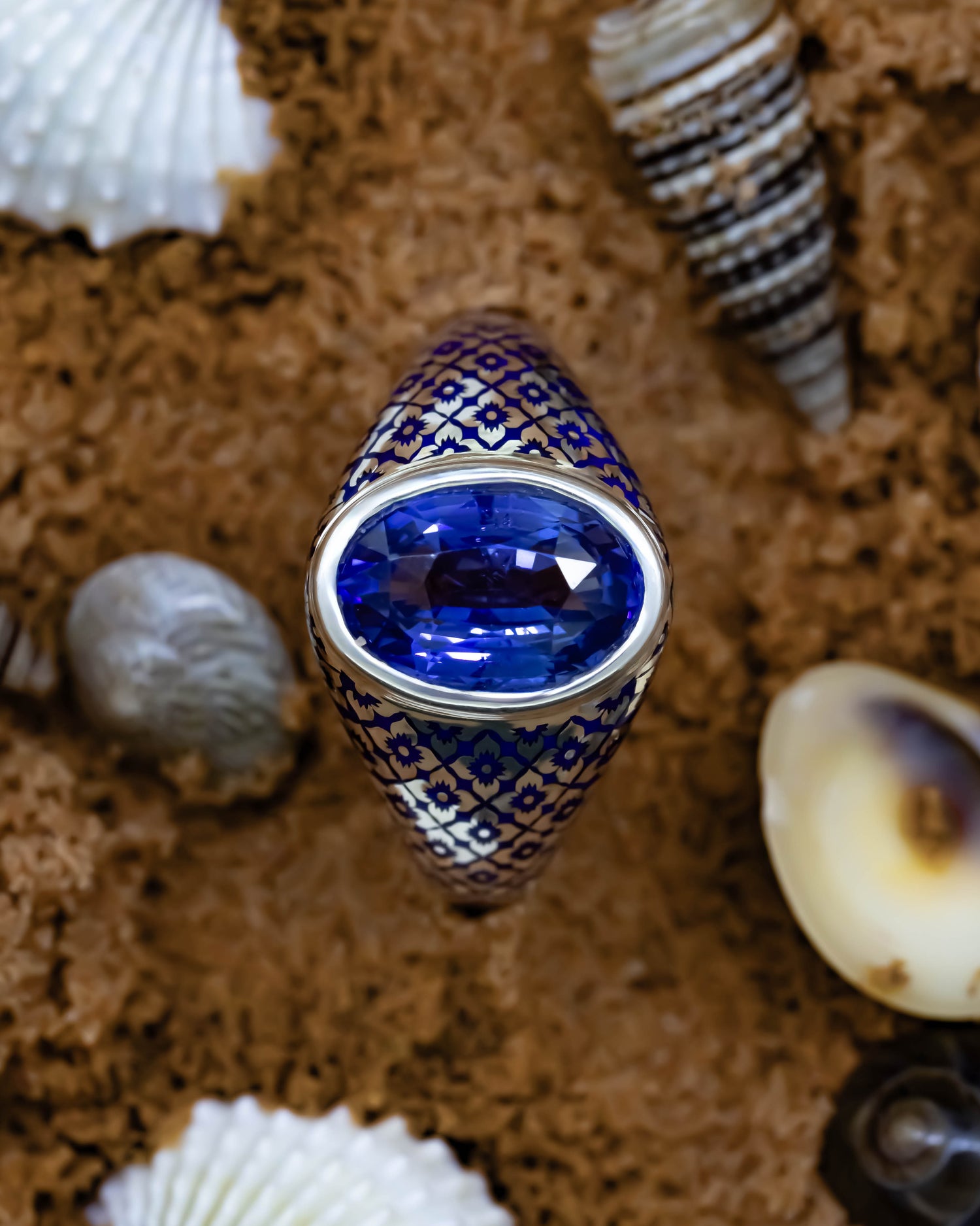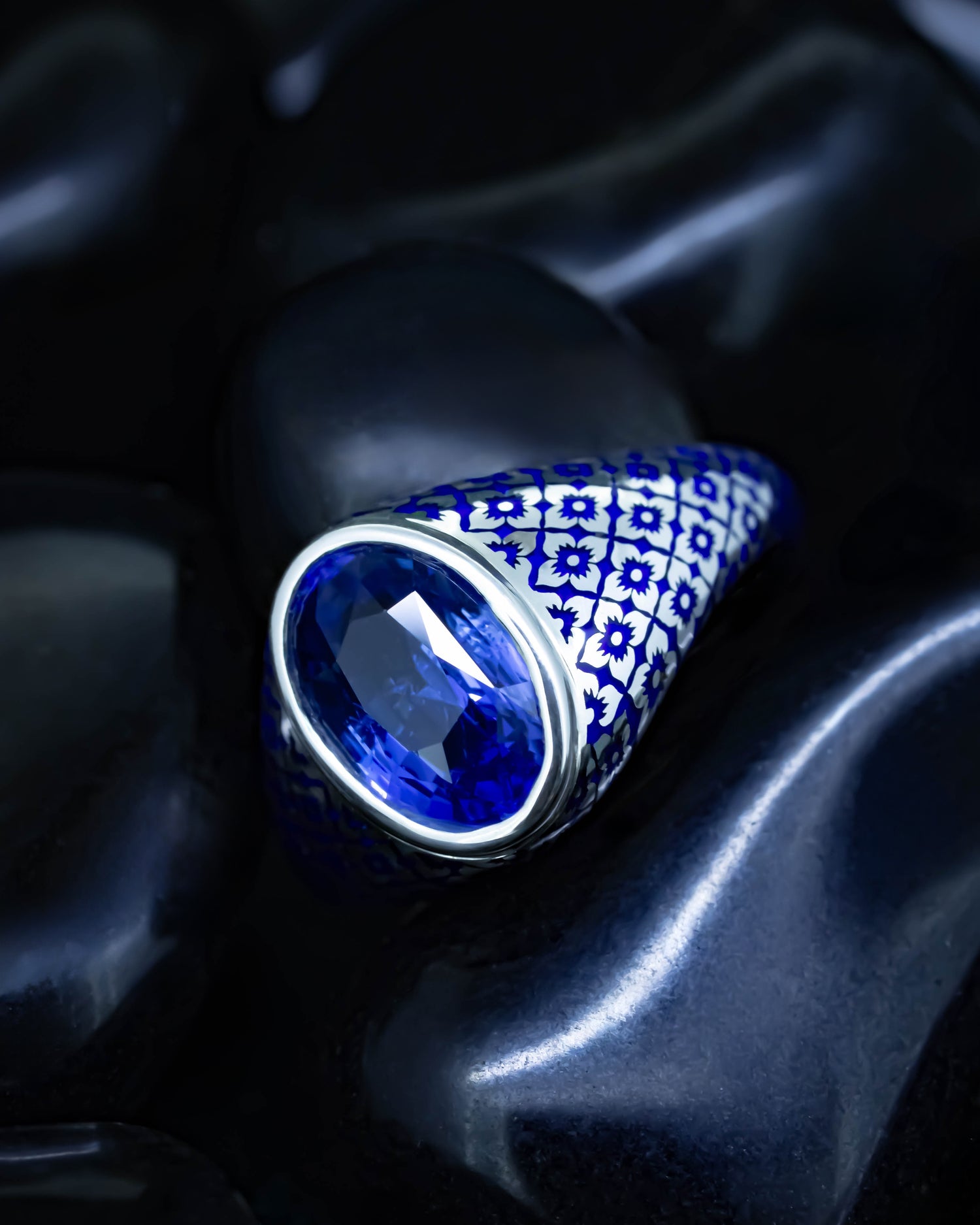 Once the enamel work was complete, the piece was carefully filed to remove all excess enamel, ensuring it sat completely flush with the surface. After this, the sapphire was set, completing all the structural elements of the ring.
