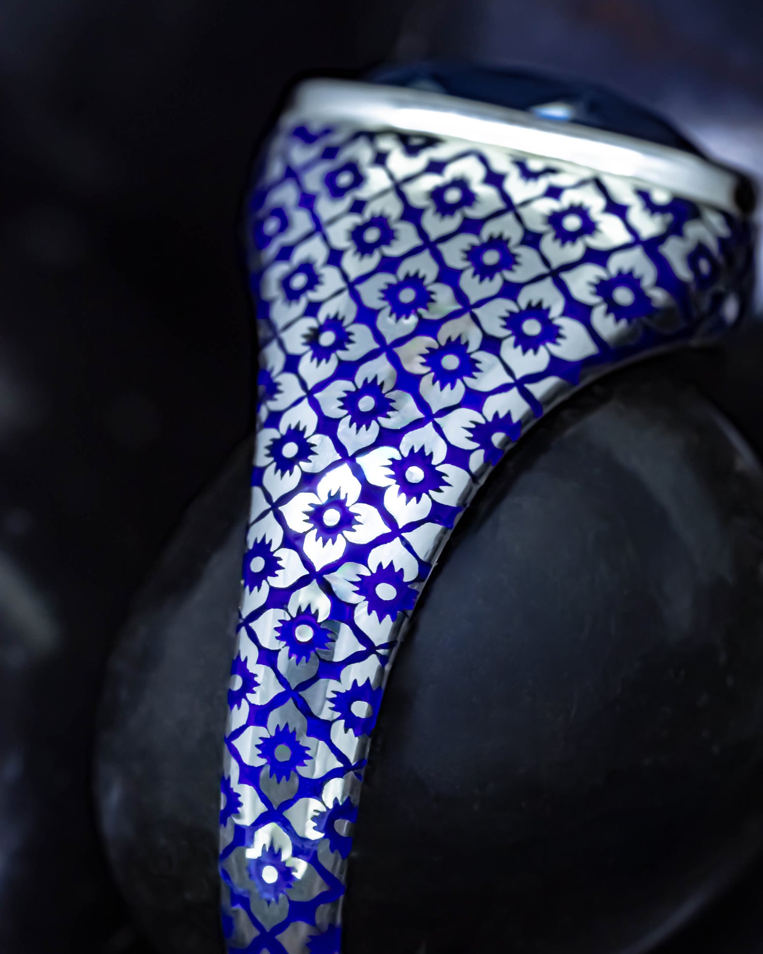Following the finalised design, the ring was cast in 92.5 Sterling Silver, translating the approved form into metal with careful attention to proportion and surface clarity. Before any polishing was carried out, the inlay was filled with ceramic enamel, with the shade of blue precisely matched to complement the colour of the sapphire.