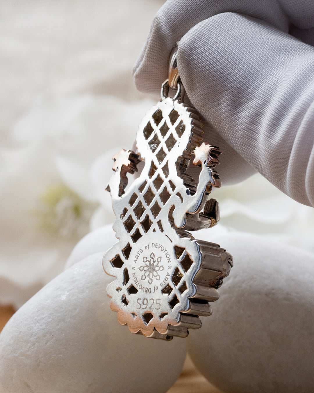 Lakshmi Devi, the bringer of prosperity and blessings, is beautifully depicted in this pendant. Made from 92.5 sterling silver with gold plating and rose gold-plated lotuses, it’s a timeless piece honoring her divine grace.