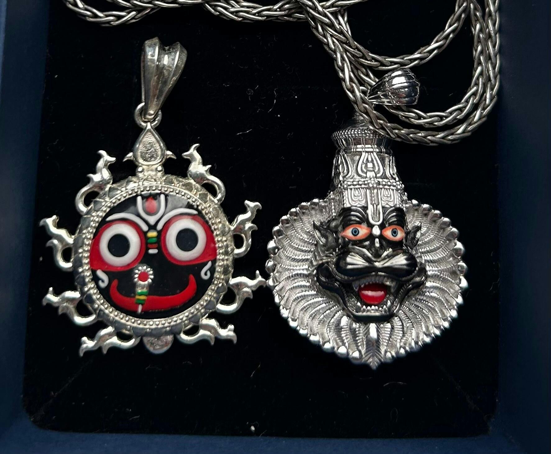 This glorious form of lord Narasimha represents the moment he calms down and is pacified by Prahlad Maharaj. It has been masterfully crafted from 92.5 sterling silver and white rhodium plated. It has a silver color and hence can be worn with most outfits.