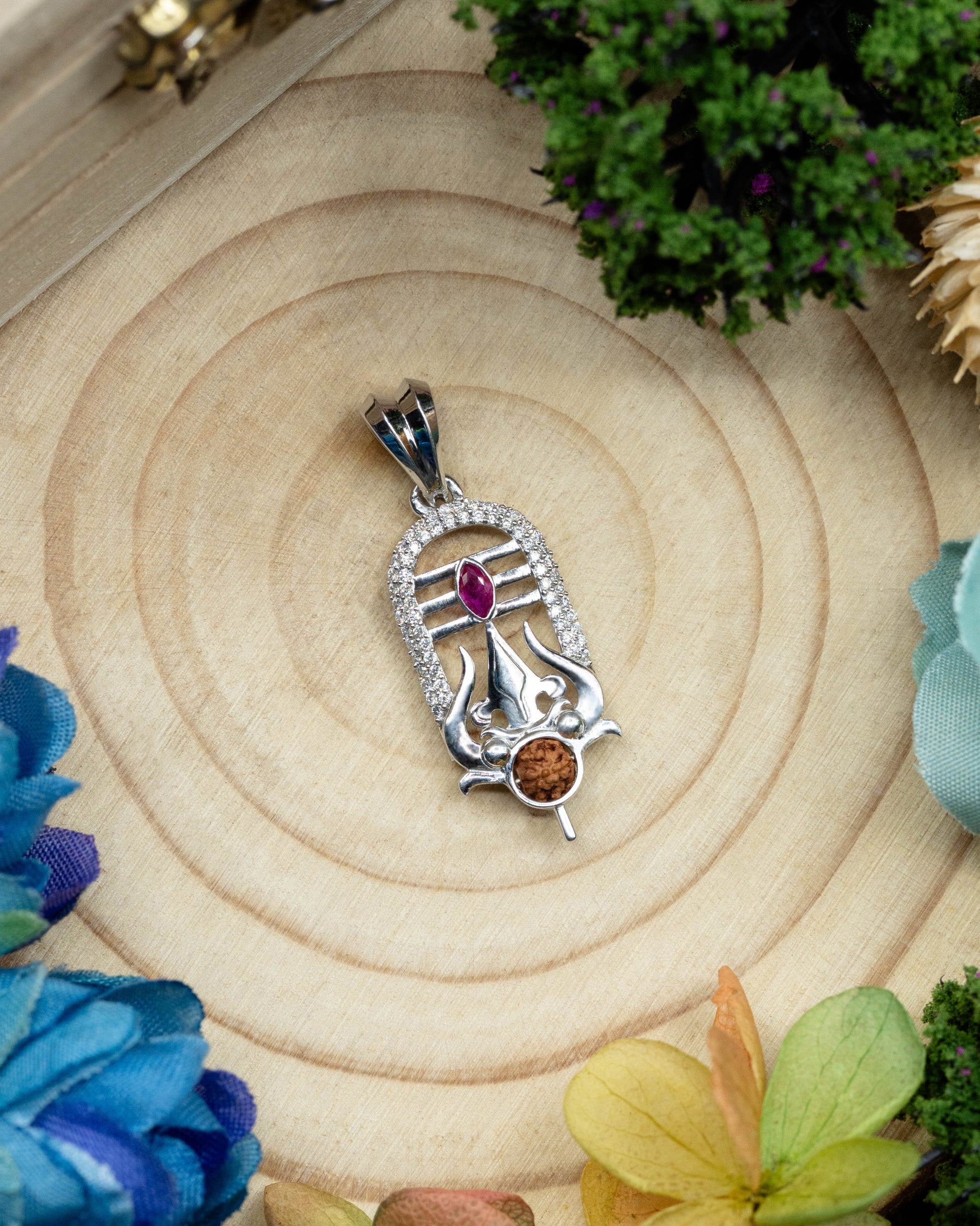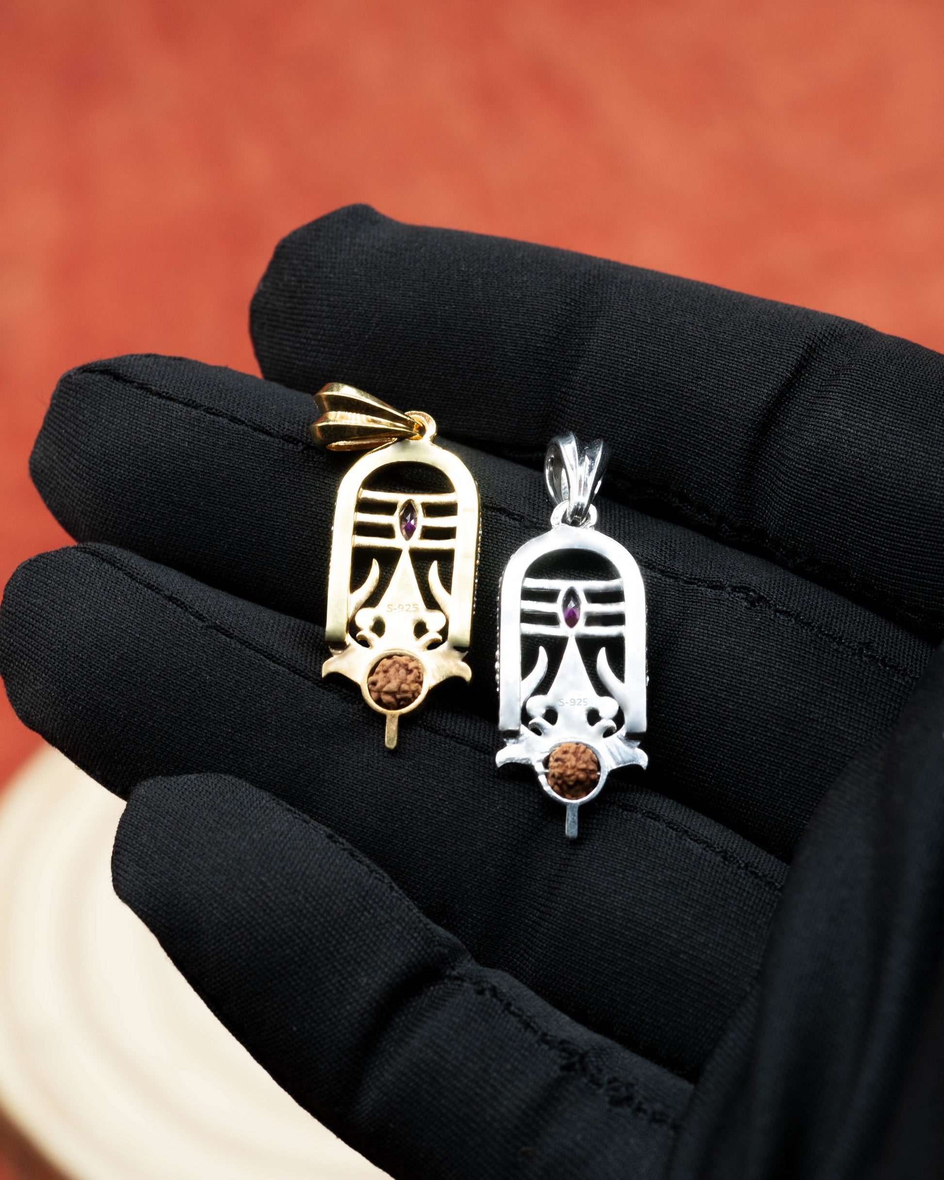 The Rudralingam pendant brings together two revered elements — the Rudraksha and the Lingam — in a refined and balanced design. Each piece is crafted in 92.5 Sterling Silver, with precision-set moissanite stones and a marquise-cut gemstone accent for a subtle, elegant shimmer.