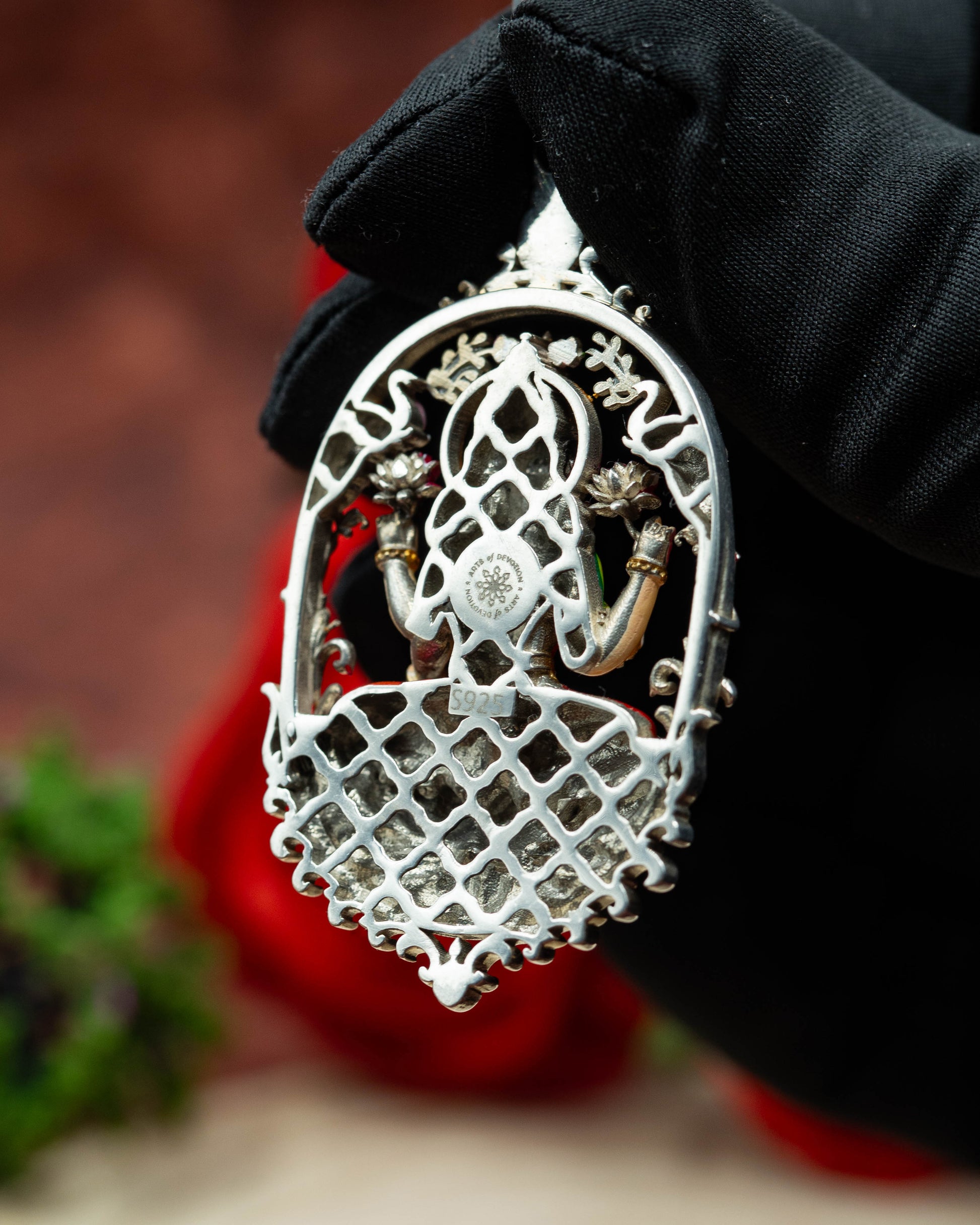 Laxmi Devi, the Goddess of wealth, prosperity, and well-being, is revered as the source of abundance and harmony in every home. Hand-painted in vibrant enamel and crafted in 92.5 Sterling Silver, she is seated upon a lotus and holding lotuses in Her hands and is the embodiment of purity, fortune, and the promise of a prosperous life.