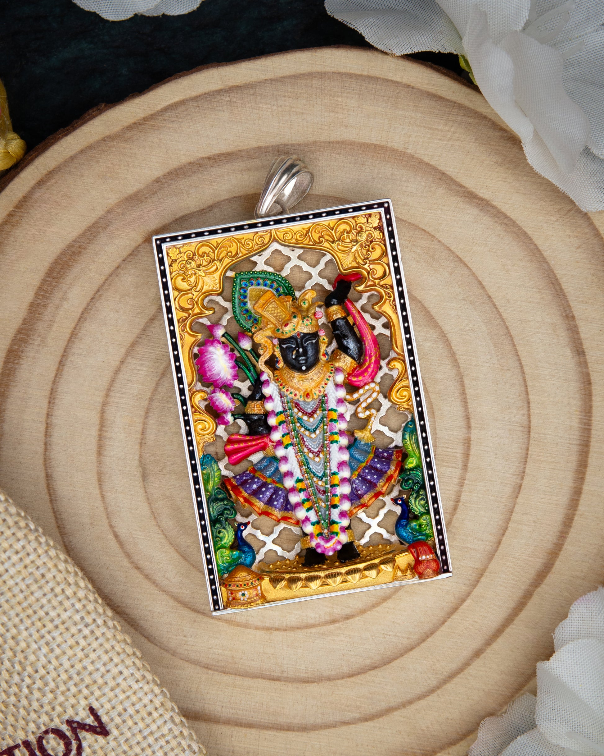 The SriNathji pendant perfectly portrays the Lord in His iconic stance lifting Mount Govardhan, brilliantly brought to life with exceptional sculptural detailing and precision. The form captures the familiar darshan with deep respect, preserving the subtle grace and dignity of the traditional iconography.
